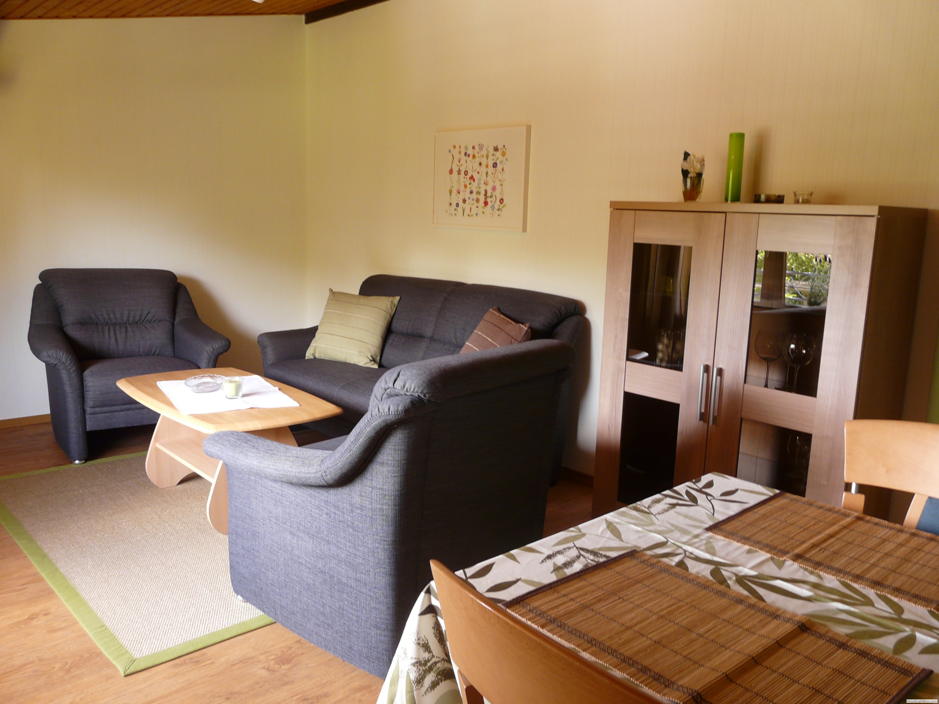 Wohnzimmer: Sitzgarnitur, Esstisch mit 4 Stühlen, Farb-TV, Stereoanlage
